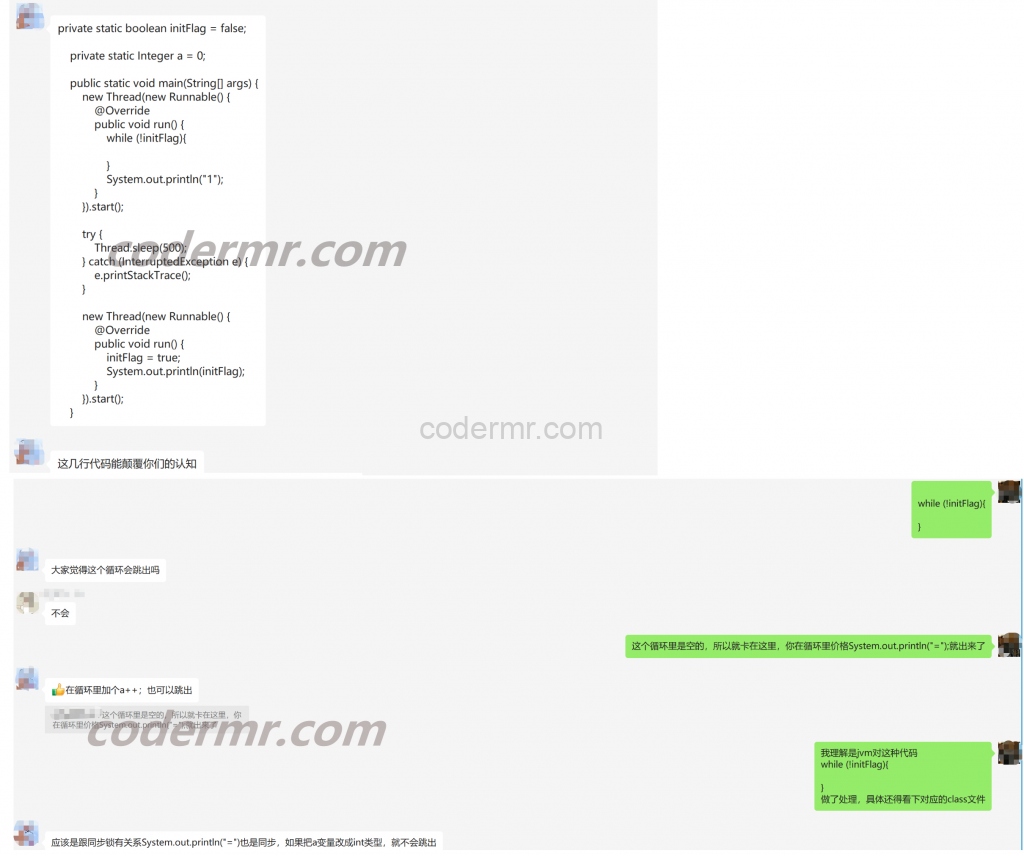 上面的线程 1 第 19 行 while 中 !initFlag 为 true ,然后会卡在 while 循环中 ,然后下面的线程 2 修改 initFlag 为true,然后输出 true ,initFlag 改为 true 了,那么第 19 行的 !initFlag 就是 false 了,上面的线程 1 应该跳出 while 循环,然后输出1,线程 1 输出 1 和 线程 2 输出 true 的顺序可能会变。